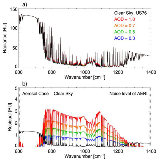 The magnitude of down-welling emitted radiance in the thermal infrared spectral region is significantly affected by the atmospheric state [52]. Therefore, we simulated the first sensitivity test using LBLDIS to investigate the impacts of various atmospheric thermodynamic profiles and aerosol in the spectral region of AERI. Three atmospheric profiles—U.S. Committee on Extension to the Standard Atmosphere 1976 (US76), Middle Latitude Summer (MLS), and Middle Latitude Winter (MLW)—were considered, with the same aerosol condition (1.0 of AOD for CA) and compared with the clear-sky condition (Figure 4).