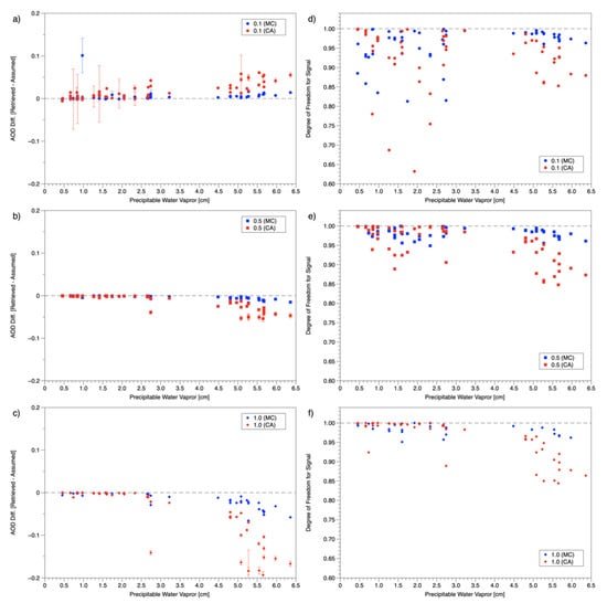 (a–c) The difference between the retrieved and assumed AOD and (d–f) DFS as a function of the PWV. These estimated results were acquired from the simulated radiance using the thermodynamic profiles from ERA-5 data, and AOD was assumed to be 0.1 (circle), 0.5 (square), and 1.0 (diamond) for the CA and MC types.