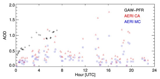 Finally, the AOD retrieved from the AERI observations with assumption of two aerosol types (CA and MC) was compared with the GAW-PFR observations as a function of time (Figure 10). The GAW-PFR data exist only for the daytime, from 00 to 08 UTC (09 to 16 local time), as they observes the shortwave radiance incoming from the sun. Here, the observed AOD from GAW-PFR ranged from 0.4 at 00 UTC to 1.2 at 07 UTC. This demonstrates that the high temporal resolution beneficially captures the evolution of pollutions in the atmosphere. As mentioned in a previous sensitivity test, due to the emissivity difference between MC and CA in the spectral bands used in the ARAOE algorithm, the AOD derived for MC was, overall, slightly lower than those derived for CA.