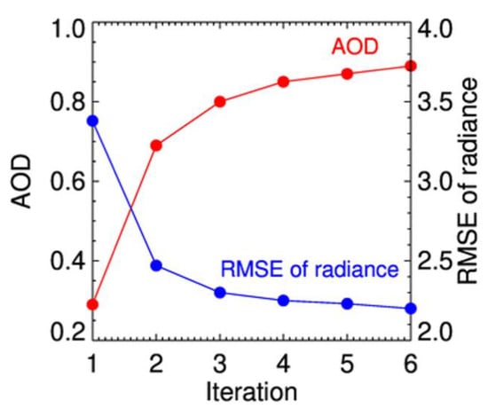 Figure 12 shows the variations in AOD and root mean square error (RMSE) between the observed and simulated radiance at each iteration step until the algorithm reached the optimized solution at 04:53 UTC on 21 October 2010. At each iteration step, the AOD convergence process was clearly revealed. The AOD increased from 0.3 in the first iteration to 0.9, which is a convergent state that in good agreement with the AOD of 0.91 from GAW-PFR. Simultaneously, the RMSE of radiance decreased from 3.4 to 2.2 RU with each iteration step. These results show the good performance of the retrieval algorithm and suggest the possibility of AOD retrieval using infrared radiance with a well-defined thermodynamic profile and an aerosol model.