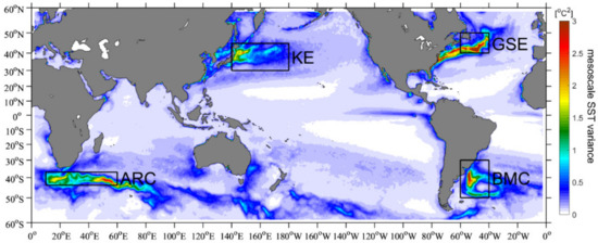 Oceanic mesoscale eddies, characterized by length scales of tens to hundreds of kilometers [1], account for 70% of the kinetic energy in the global ocean [2], and they play vital roles in the redistributions of mass, heat, salt, momentum, and nutrients [3,4,5,6,7,8,9,10,11]. These eddies are ubiquitous in the global ocean and particularly active in the subtropical western boundary currents (WBCs) and their extensions [1,12,13,14,15]. The WBCs and their extensions are highly dynamically unstable, generating frontal meanders, cutoff mesoscale eddies, and turbulent flow fluctuations over a broad range of spatiotemporal scales [16,17,18]. Geographically, the five major subtropical WBCs and their extensions are known as the Kuroshio Extension (KE) and the East Australian Current (EAC) in the Pacific, the Gulf Stream Extension (GSE) and Brazil–Malvinas Confluence (BMC) in the Atlantic, and the Agulhas Return Current (ARC) in the South Indian Ocean. In addition to being action centers for the dynamic ocean circulation changes, the WBCs and their extensions are also hotspots for thermodynamical interaction between SST anomalies (SSTAs) and the overlying atmosphere [13,19,20,21,22]. Such interaction is scale dependent [23]. On a large scale of >500 km, the correlation between SST and wind is usually negative with an increased wind speed corresponding to SST cooling, reflecting the regime that the atmosphere dictates ocean variability [24,25,26,27]. On the oceanic frontal scales of O (100 km), on the other hand, the SST–wind speed correlation tends to be positive, indicating that mesoscale SSTAs drive atmospheric variations [28,29,30]. The significance of oceanic mesoscale atmosphere (OMEA) interaction in regulating large-scale oceanic and atmospheric circulations has been increasingly recognized [30,31,32,33,34]. SSTAs of mesoscale eddies cause surface turbulent heat flux anomalies and affect the stability of the atmospheric boundary layer [30,35,36,37], exerting imprints on cloud formation, cloud liquid water, and precipitation rate [37,38].