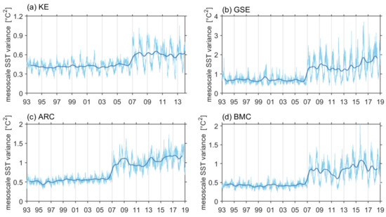 To analyze the temporal variability of the intensity of mesoscale SST, the time series of average variance in each WBC region derived from the OI.v2-AVHRR-only data are shown in Figure 2. The thin blue lines denote the daily time series, and the thick blue lines denote the 1.5-year low-pass filtered time series. One can see that the variance in the four WBC regions exhibits well-defined seasonal variabilities with strong (weak) levels in winter (summer), indicating that the mesoscale air–sea interaction is strongest in winter, which is in agreement with previous studies [13,30,33,37,49]. However, notably, the variance in all four WBC regions increased during 1993–2018, and surprisingly, the abrupt increasing points all appeared in 2007. The mean variance in the four regions during 2007–2018 is 1.05 °C2, which is approximately twofold larger than that during 1993–2006 with 0.54 °C2.