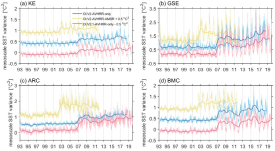 Time series of the mesoscale SST variance in the (a) KE, (b) GSE, (c) ARC, and (d) BMC regions. The blue, yellow, and red lines denote the values based on the OI.V2-AVHRR-only data, OI.v2-AVHRR-AMSR data, and OI.v2.1-AVHRR-only data, respectively. For comparison, the yellow (red) line is the original value plus (minus) 0.5 °C2. The thin and thick lines denote the daily and 1.5-year low-pass filtered time series, respectively.