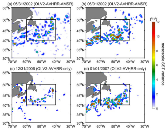 The snapshots of mesoscale SST variance in the GSE region based on the (a,b) OI.V2-AVHRR-AMSR data on (a) 31 May 2002 and (b) 1 June 2002; (c,d) OI.v2-AVHRR-only data on (c) 31 December 2006 and (d) 1 January 2007.