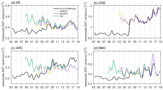 Time series of the 1.5-year low-pass filtered mesoscale SST variance in the (a) KE, (b) GSE, (c) ARC, and (d) BMC regions. The black, yellow, purple, and green lines denote the value based on the OI.v2-AVHRR-only data, AMSR-E data, WindSAT data, and TMI data, respectively.
