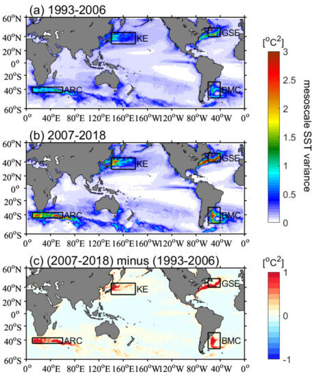 Mean mesoscale SST variance distribution derived from OI.v2-AVHRR-only data during the periods of (a) 1993–2016, (b) 2007–2018, and (c) 2007–2018 minus 1993–2016.