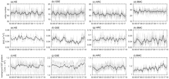 We also examined the potential dynamic effects, including the mesoscale eddy number, the EKE, and the background SST gradient (Figure 7). On the one hand, the strength of mesoscale eddies can influence the mesoscale air–sea interaction that stronger eddies correspond to more intense heat transfer between ocean and atmosphere [36]. On the other hand, the mesoscale SST can be generated by the lateral stirring of mesoscale eddies, distorting the background SST, and therefore, the large background SST gradient is favorable for enhanced mesoscale SST [73,74,75]. Figure 7a–d show the eddy numbers in each WBC region based on the mesoscale eddy dataset. The eddy numbers are counted by the daily snapshots of the eddies existing in each region, regardless of whether they are the same eddy on different days. The thin gray lines denote the daily time series, and the thick black lines denote the 1.5-year low-pass filtered time series. It is shown that the eddy numbers remained stable in each region during 1993–2018. In addition, the EKE is calculated by