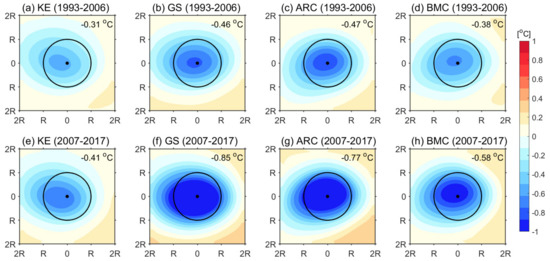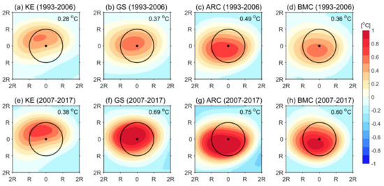 The composite Anticyclonic Eddy (AE)-induced SSTA in the (a,e) KE, (b,f) GSE, (c,g) ARC, and (d,h) BMC regions during the periods of (a–d) 1993–2006, and (e–h) 2007–2017 based on the OI.v2-AVHRR-only data. The circles denote the normalized eddy radius, and the dots are the eddy centers.