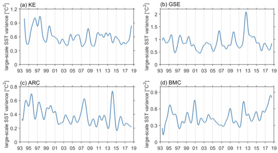 Time series of the 1.5-year low-pass filtered large-scale SST variance in the (a) KE, (b) GSE, (c) ARC, and (d) BMC regions based on the OI.v2-AVHRR-only data.