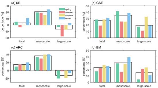 The rate of total, mesoscale, and large-scale SST variance change during 2007–2018, compared with the period of 1993–2006 in different seasons in the (a) KE, (b) GSE, (c) ARC, and (d) BMC regions based on the OI.v2-AVHRR-only data. The green, red, yellow, and blue bars denote the seasons of spring, summer, autumn, and winter, respectively. The black outlines are the average values of the four seasons.