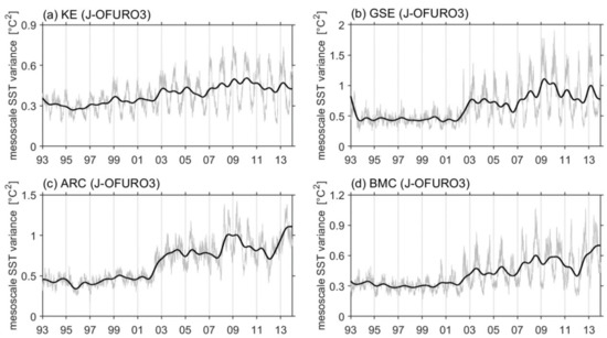 Time series of the mesoscale SST variance based on the J-OFURO3 data in the regions of (a) KE, (b) GSE, (c) ARC, and (d) BMC. The thin and thick lines denote the daily and 1.5-year low-pass filtered time series, respectively.