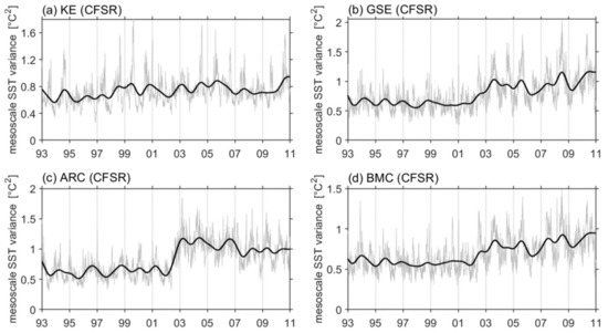 Time series of the mesoscale SST variance based on the CFSR data in the regions of (a) KE, (b) GSE, (c) ARC, and (d) BMC. The thin and thick lines denote the daily and 1.5-year low-pass filtered time series, respectively.