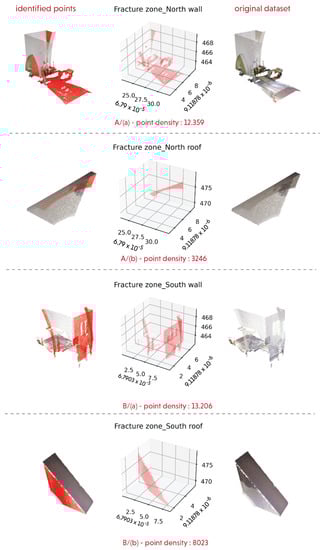 Fracture plane points based on segmented datasets: A/(a) Fracture zone–North wall; A/(b) Fracture zone–North roof; B/(a) Fracture zone–South wall; B/(b) Fracture zone–South roof.