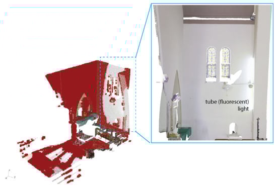 This study specifically selected the Altar room as a scanning dataset (see Figure 3). This room occupies the upper part of the trunk of the cross. The selected area contains 35 million points after being deducted from the original dataset. In order to maintain computational time and cost during the analysis, the trimming dataset was then subsampled. The subsampling dataset ultimately yielded around 121.386 points. The selected area consists of walls, tiles, windows, and some furniture, such as chairs, desks, and lamps).