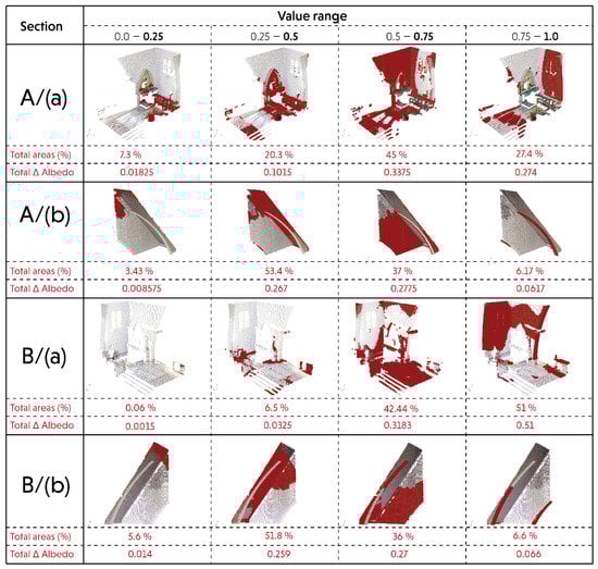 According to the material property distribution plotted in Figure 6, we can further calculate the total (Δ) albedo modification in the existing dataset according to its point density. This is essential to identify specific parts that might need further actions due to microclimatic impacts (see Figure 8). To do so, the total identified areas are multiplied by the upper range of albedo values. This then yields the total increment (Δ) of albedo in a certain range of the dataset. For example, Sections A/(b) and B/(b) contain a similar pattern regarding high and albedo values. The trend shows that the highest albedo corresponds to the upper range of 0.5, which is around 0.267 or 53.4% for A/(b), while it is around 0.259 or 51.8% for B/(b). This pattern is consecutively followed by a range of upper values of 0.75 (A/(b)—0.2775 or 27% and B/(b)—0.27 or 36%), 1.0 (A/(b)—0.0617 or 6.17% and B/(b)—0.066 or 6.6%), and 0.25 (A/(b)—0.008575 or 3.43% and B/(b)—0.014 or 5.6%). As for A/(a) and B/(a), the only similar pattern of total (Δ) albedo is found in the upper value range of 0.25 with 0.01825 or 7.3% and 0.014 or 5.6%, respectively. Considering that the densest point is located at low albedo values, further treatment is required to reduce the heat absorption in those areas. For example, the Church management team or the heritage organization could install thermal insulation or modify the existing surface material to do a preventive action for specific areas. As for sections A/(a) and B/(a), the low albedo values are more visible around the furniture, not only because of the disjointed geometries, but also because of the dark color and rough material surfaces.
