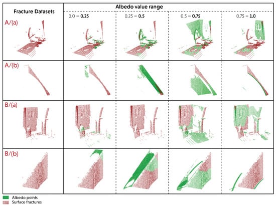 Figure 9 exemplifies several interesting trends regarding the overlap between albedo (green datasets) and surface fracture (red datasets). For example, the densest albedo values vary in each section of the fracture dataset. This can be observed in sections A/(a) and B/(b) in the range of 0.75, which shows the greatest overlapping albedo points, while Sections A/(b) and B/(a) are identified in the range 0.5 and 1.0, respectively. At a glance, these identified ranges show a performance contradiction between the thermal and surface properties of the material dataset. This is because a higher albedo value indicates a smoother or lighter surface of the dataset, while the fracture dataset itself designates a higher surface porosity or high irregular surface morphology. Accordingly, by having high albedo values on identified surfaces, fractures are quite contradictory, such as in sections B/(a) (at a range of 1.0) and B/(b) (at a range of 0.75). This often occurs on flat surfaces with bright colors, due to the limited parameters used for dataset correction. In order to avoid this ambiguity, we can focus on areas with less overlapping albedo points as they clearly consist of low surface performances. Furthermore, Figure 9 also shows that areas with low albedo values not only provide us with significant information regarding vulnerable surfaces in the existing heritage building, but also strengthen our hypothesis regarding fracture datasets.