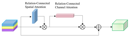 Attention is an important tool for visual perception that allows you to focus on the most relevant element of the input signal, which is critical in object detection. SENet [23] employs a channel attention method to learn the weights of each channel in the feature map and calculates the relevance of each channel automatically. The non-local Net [26] provides a global attention method that can capture long-range relational dependencies and collect information from all locations by learning pairwise relations in a deterministic manner to improve the object’s location characteristics. Inspired by SENet and the non-local Net, we designed a relation-connected attention module (RC-AM) which can mine more valuable information from the features themselves and the relations between features, and acquire attention in a learning manner. RC-AM can effectively refine the features and distinguish similar features between objects of the same scale. As depicted in Figure 4, this module is mainly composed of two parts: Relation-Connected Spatial Attention and Relation-Connected Channel Attention. These two sub-modules are combined through residual connection.