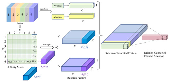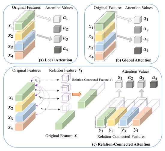 To solve these problems, we propose a relation-connected attention module that explores global feature information to jointly learn attention weights by fusing features and their relationships. Figure 5c shows the main idea for our relation-connected attention. We first investigated the relationship between the feature unit itself and other feature units by calculating their affinity. Then, they were concatenated together to reflect the current feature unit’s global information. Specifically, the module uses to indicate the affinity between the ith and the jth feature unit. For the ith feature unit, its affinity vector is . which represents the ith row of the affinity matrix, which indicates the relations between the feature unit and all other feature units. denotes the ith column of the affinity matrix, which indicates the relations between all other feature units and the ith feature unit. describes the bi-directional relations between the ith feature unit and the jth feature unit. All the affinity vectors form the affinity matrix . The feature itself and the affinity relations are then combined to generate , which is used to infer attention in a learned function. This method for learning attention weights is applied to both spatial and channel attention to obtain more discriminative features.