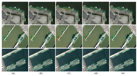 Comparative visual results with other methods on the HRSC2016 dataset: (a) ground truth; (b) R2CNN; (c) RRPN; (d) SCRDet; and (e) ours.
