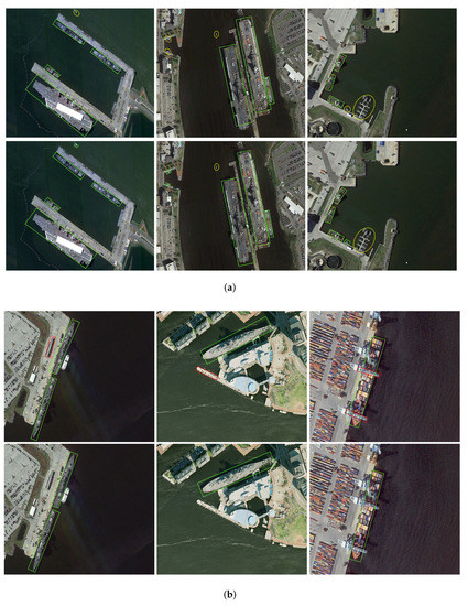 We adopted Adam [32] as the model optimizer in the training stage with a total of 300 epochs. The training batch size is set to 6, and the learning rate is for the first 100 epochs and for the next 200 epochs. Our experiments are implemented in Pytorch 1.5.0 on a NVIDIA Titan XP GPU. The FPN-based Faster R-CNN is used as the baseline and the backbone for initialization in the end-to-end training is ResNet-50 pre-trained on ImageNet. Before training, the images are normalized to a size of 608 × 608 for NWPU VHR-10 and 800 × 800 for HRSC2016 while maintaining their original aspect ratio to prevent the distortion of the target and facilitate image batch training. On the HRSC2016 dataset, the scales of the anchor are set to (1/1, 1/2, 1/3, 1/4, 1/5, 1/6, 1/7, 1/9) in order to cover as many ship scales as possible. In the RPN training stage, when the IoU > 0.7, the anchor is regarded as a positive sample, and as a negative sample when IoU < 0.3. The other anchors will not be used in the training. Furthermore, in Equation (5), the balance hyperparameters are taken as 4, 2 and 1, respectively. and are set to 8.