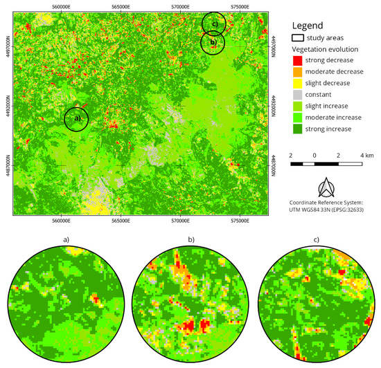 The Theil–Sen slope map (Figure 4) was calculated for the NDVI, a vegetation index that is able to express any eco-physiological stresses on vegetation [42,130]. Therefore, starting from the NDVI Theil–Sen slope, a map of the vegetation evolution (Figure 5) was created for each study area to identify any stresses and trace them to the factors that they induced. In more detail, this map on vegetation growth/degrowth rates in the period 1990–2018 identifies the following classes: