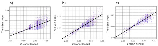 To carry out this verification, the Mann–Kendall test was used, starting from the Theil–Sen slope trends. In fact, the Z Mann–Kendall test [115,116,117] is not only able to verify the existence of a trend but also to estimate its statistical significance (separating the hypothesis H0 = absence of trend from H1 = presence of monotonous trend). On the other hand, Z Mann–Kendall is not able to identify the trend monotonicity, unlike the Theil–Sen slope estimator. Instead, because the Theil–Sen estimator does not provide any information regarding trend significance, it is very often used in combination with the Mann–Kendall test [79,118,119,120,121].