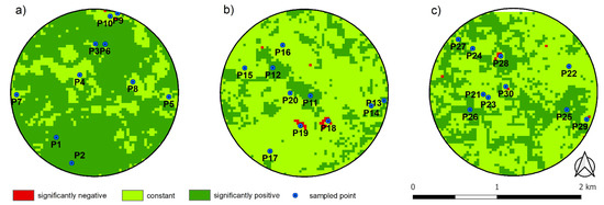 For the survey sites, consisting of circular areas with a radius of 1 km, the distribution percentages of the vegetation evolution classes are shown in Table 3.