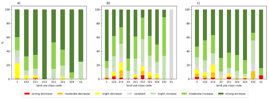 Percentage distribution of vegetation evolution classes vs. land use class code: (a) Aia dei Monaci, (b) Montegrosso-Pallareta, (c) Vallone Calabrese. Land use class codes are described in Table 1.