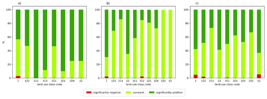 For Aia dei Monaci (Figure 8a), especially moderate and strong vegetation decreases occurred very often in areas classified as “Non-irrigated arable land” (code 211). The cause was the decrease in NDVI due to a land use change from uncultivated lands (pasture and wooded pasture) to a resumption of cereal cultivation, which has notoriously lower NDVI average values. However, these areas represent only 0.7% of the entire area of Aia dei Monaci and, as will be seen below, show decreases that the statistical analysis considered insignificant. Further decreases were related to the expansion of urbanized areas, due in particular to the cultivation of a stone quarry located in the north of the study area. The most sustained increases, as expected, concerned areas with forest cover (stands of oak species). The land use class relating to “Transitional woodland-shrub” also showed markedly positive trends. These are areas in which the abandonment of crops or the reduction in livestock pressure has led to the expansion of forest areas. These are the typical areas of forest recolonization.