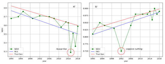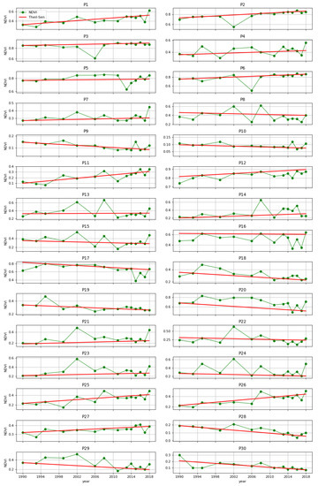 The procedure adopted for the multitemporal analysis of processed Landsat data in the period 1990–2018 was the Theil–Sen median trend [95,96]. The non-parametric Theil–Sen estimator tends to produce accurate confidence intervals even when data are not normally distributed [97,98] and in the presence of heteroskedasticity [99,100]. The method is robust with regard to outliers [101,102], which are always present in a time series of RS data and represent a “disturbance” with respect to the analysis of vegetation trends. Furthermore, in RS, this non-parametric procedure is considered robust with respect to the seasonality, non-normality and frequently present autocorrelation both at intra and interannual scale [103,104,105].