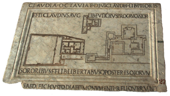 - Rodríguez Almeida, E. Forma Urbis Antiquae. Le Mappe Marmoree di Roma tra la Repubblica e Settimio Severo. In École Fra-nçaise de Rome: Le Forme Marmoree di Roma di Tradizione Augustea; Publications de l’École française de Rome: Rome, Italy, 2002; Volume 79, p. 2013. Available online: https://books.openedition.org/efr/1886?lang=en (accessed on 27 November 2021).