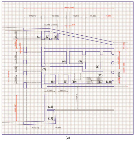 The most interesting and amazing thing is that the precision of the conventions and symbols seems to be practically unchanged after two millennia. The graphical description of the walls, for example, is defined by two parallel lines cut nearby the sectioned light compartments. According to the recommendations of Vitruvius, the temple was most likely positioned taking into consideration the apparent path of the stars [23], while it is possible that the positioning of the monumental building was carried out on a trigonometric and, perhaps, astronomical-projective basis [24]. As far as the distribution of the rooms of the aedificium custodiae is concerned, where functional needs are more urgent, the microclimatic needs imposed by the habitability were certainly taken into account, considering that usually the buildings had no windows [18]. The rooms of the villa are distributed around the path connecting the anterior and the posterior porch and in the middle is visible the vertical connection for the first floor. The stairs are marked, as still happens today, with a very long and acute angular sign, a sort of “V”, as in the access corridor to the underground cubicle adjacent to the temple. Considering the hypothesis regarding the internal distribution of the rooms as found in the literature (Figure 3), it is fundamental to identify the specific signs that univocally depict the features according to methodologically repeatable procedures. This process makes them criticisable in any place and time.