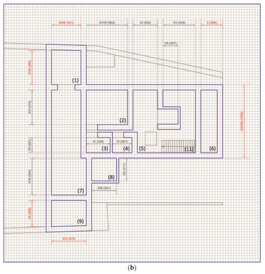Vectorisation of the unified iconographies in the reduction scale. Comparison of the data obtained from the no-contact survey, from the analyses available in the literature, and from the calculation of the annotated measurements in Roman figures. Hypothesis of the derived commensuration grids for the ground and the upper floor: (a) drawing and measurements of the lower floor; (b) drawing and measurements of the upper floor; and (c) comparison between the vectorisation done on the orthophoto and the reconstructed 3D model based on recalculated measurements.