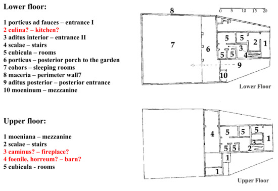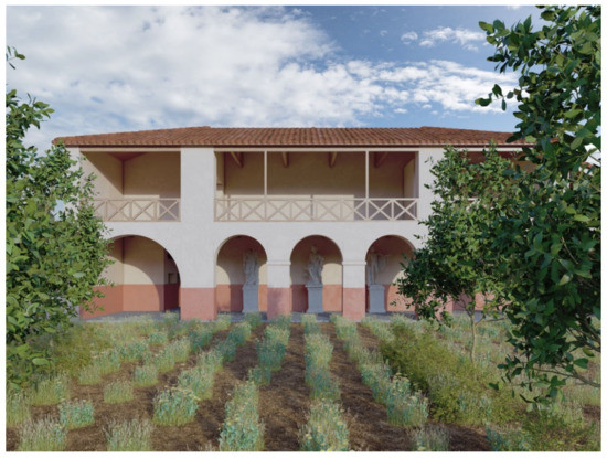 As highlighted in the text by Emilio Rodriquez Almeida [17] (Figure 13, Chapter IV), it should be remembered that the Romans did not know about fireplaces, which appeared in Italy only around the 13th century [25] (p. 191). The term Atrium itself derives from “ater”, which means ‘dark’ or ‘black’, due to the black soot that covered the walls in the place where originally wood was burned to cook or smoke food and, subsequently, water was collected. The smoke mainly found its way out in the natural draft derived from the hole in the roof, an extreme legacy of the one made on the top of pre and protohistoric huts. From this necessity derives the opening for light and air close to the kitchen that also provided the necessary light to the staircase connecting the side of the rustic villa to the rear and front porch.