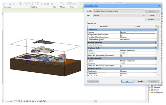 From the CAD planimetry imported into the Revit software, the geometries were connected to and associated with exclusive types technologically determined and stored in the dedicated system instructions (Figure 9). In other words, the identified surfaces were linked to contents of exclusive types (families) [32].