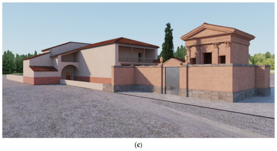 The 3D model of the villa and the temple (Figure 7 and Figure 8) was then produced inside Revit software because of the possibility of using procedural modelling. All the information gathered through the analysis of the archival and bibliographic documentation, the calculations done on the measurements, and the plans engraved on the slab permitted us to reach an accurate reconstruction of the building. As shown in the figures, the process started with the planimetric drawing of the three parts of the building complex, readjusted with the calculation of the scale reductions. Based on this information, and with the help of coeval examples still visible, the vertical structures were recreated.
