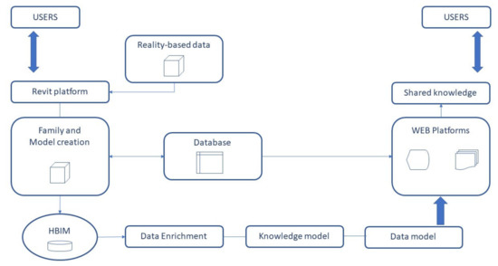 For the preservation of Cultural Heritage, it is mandatory to find a way to take care of its redevelopment over time. Hence HBIM, or the need to use digitalisation by applying BIM to historic buildings, which, by their very nature, are often the result of layering of evolutionary phases, materials, and architectural changes over the years. All this information is difficult to assimilate through traditional management, which denotes a high risk of loss of important data necessary to the subsequent intervention phases. Furthermore, the entities that manage the historical-artistic heritage are usually multiple and different from each other, often leading to the fragmentation of information. Therefore, every time an intervention has to be planned on an existing historic building, most of the initial time is spent on researching and organising information and data. Historical or Heritage Building Information Modelling is the process applied to existing buildings or monuments that aims not only at the mere restitution of the three-dimensional model, but above all at the creation of so-called “intelligent models”. The latter are rich in geometric information and include the state of conservation of the materials, in which all components are parametric objects with well-defined semantics and capable of containing all the historical information derived from appropriate documentary analyses [8]. The objective of the HBIM process, therefore, is to generate an information model that is congruent and geometrically consistent with reality, where most of the information collected up to that moment is contained, as if it were a digital “catalogue” that can be interrogated in case of necessity [9]. The steps in the HBIM process can be summarised as follows: