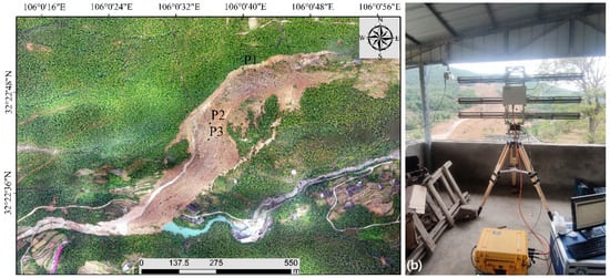(a) is an orthophoto image processed by the DJI Royal 2 drone on 30 October 2021, showing the geographic location of the study area. P1, P2 and P3 are three study points selected from different locations of the landslide. P1 is the rear wall of the landslide, P2 is the landslide platform, and P3 is the secondary step. (b) is a photo of the GPRI-II equipment and the landslide mass.