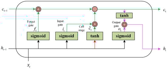For the phenomenon of gradient disappearance and gradient explosion in RNN, Hochreiter proposed a network structure to improve the gradient disappearance problem, which works in a similar way to RNN. The difference is that a memory storage mechanism is established in some units within RNN to achieve more effective information storage and updates. Figure 2 shows the internal structure of the LSTM. By analyzing Figure 2, it can be seen that LSTM is obviously different from RNN in that it adds a gating unit, and the network transmits the gating unit information and the cell state at the last moment to the next unit in the network.