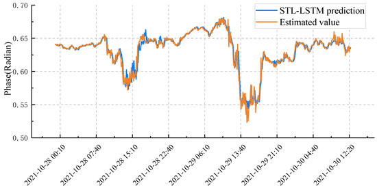 In this paper, the monitoring area was monitored for 16 days of meteorological parameters. By ensuring that the sampling frequency of GBSAR was consistent with that of GBSAR, the changes in atmospheric parameters during the observation period were obtained. According to the atmospheric phase model of GBSAR, the atmospheric phase based on the distance direction was obtained. The data set was constructed using this data, and the LSTM prediction result of the monitoring area was obtained by applying the LSTM network model, which is plotted in Figure 9.