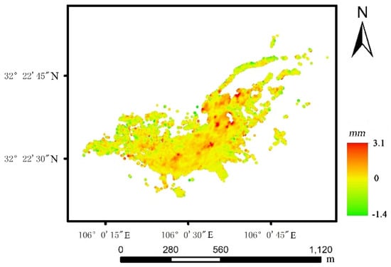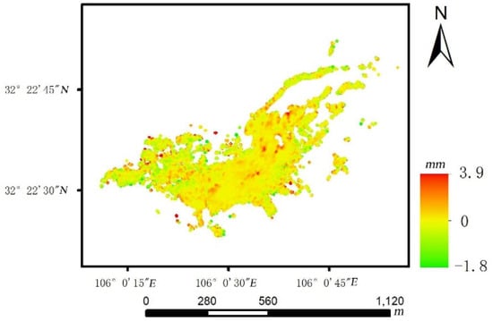 In this paper, a total of 1,398,120 PS points and the deformation amount of 59 h in the entire monitoring area were predicted, and the deformation prediction results are partially shown in Figure 10 below according to a certain time interval. To make a difference, we drew the prediction residuals as shown in Figure 11 and Figure 12, and drew the prediction residuals in Figure 13 and Figure 14. By analyzing the above results, it can be seen that the LSTM network model has high prediction accuracy in the entire monitoring area, and the prediction results of the key deformation area and the stable area are in line with the facts.