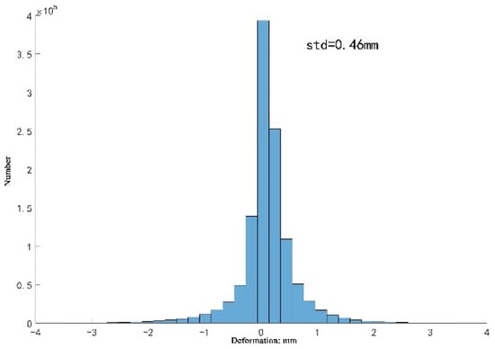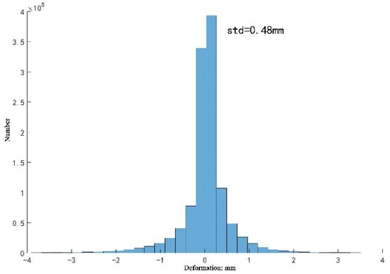 By analyzing the change curves of the three points in Figure 23, the time series results obtained by this real-time processing method are consistent with the GB-InSAR time series analysis results, which are in line with the real deformation variable changes, which proves that this method can realize real-time deformation processing. The process is as follows: select the deformation variable in the stable region for statistical analysis, and draw the frequency statistical histogram of the deformation variable in this region as shown in Figure 24: