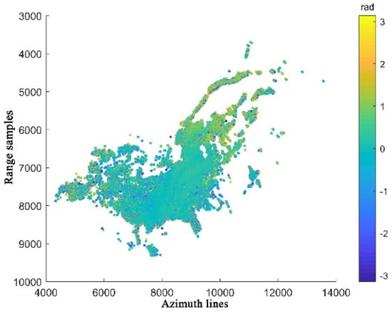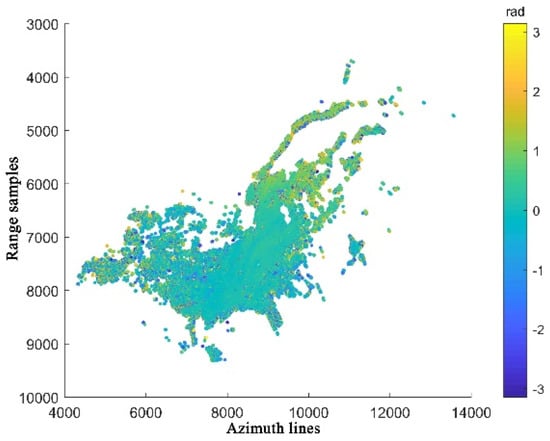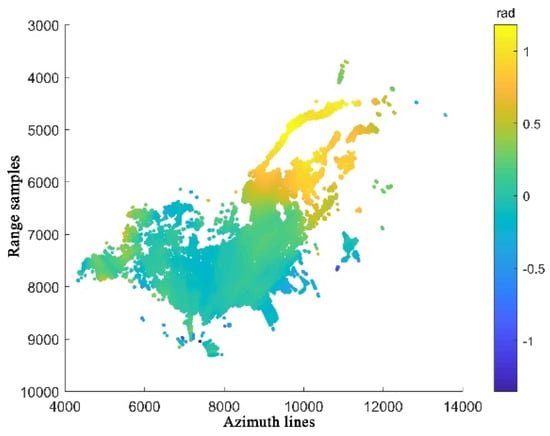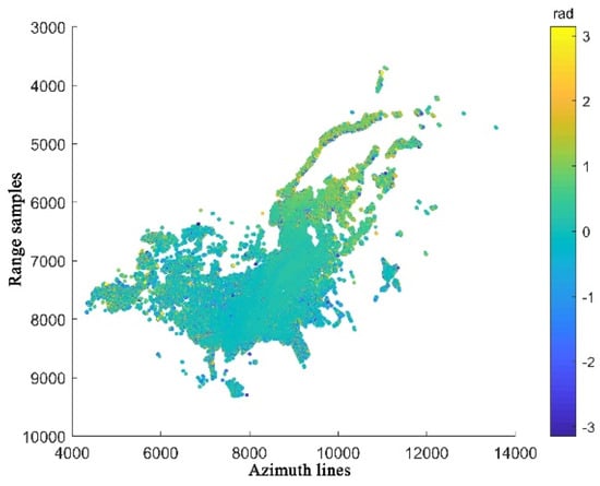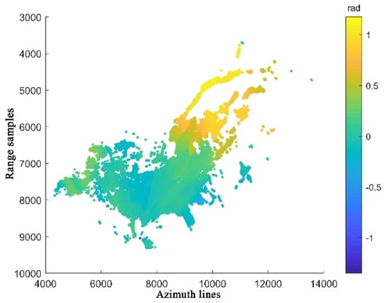 Interpolated atmospheric phase diagram. In the study area, the stable region is selected by taking the shape variable as the threshold, and the phase of the stable region is interpolated to obtain the overall atmospheric delay phase.