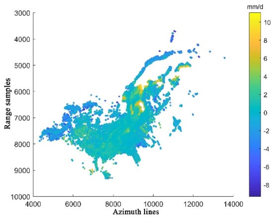 In Figure 6, in the monitoring of GBSAR, the radar transmitter moves along a fixed orbit in each measurement. After the main image is selected, PS points are selected by setting thresholds for the phase dispersion index and coherence coefficient, and then the auxiliary image and the main image are subjected to interference processing, respectively, to construct a phase model function. Then, build a Delaunay triangulation for all adjacent PS points, use the solution space search method for the phase difference of PS points on the same baseline, iteratively solve the linear deformation rate, analyze the residual phase, and estimate the atmospheric phase component. After the atmospheric phase is separated from the phase, the PS point is reselected and the above operation is repeated to obtain the deformation time series results of the monitoring area.