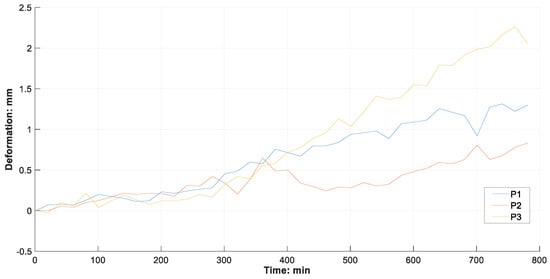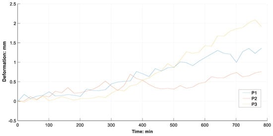 Real deformation curves of three research points. P1 is located at the crown cracks, P2 is located at the head, and P3 is located at the minor scarp. According to the analysis curve, the deformation rate of the three points is different, but all of them keep rising.