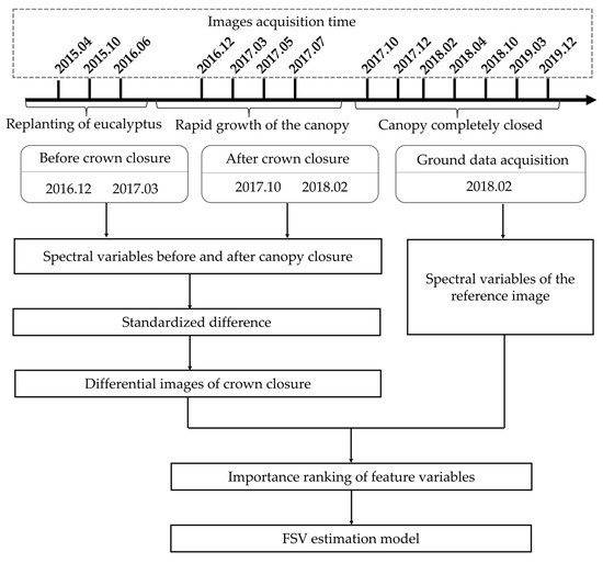 To improve the accuracy of FSV in planted eucalyptus forests, four Landsat 8 OLI and one pair of Ziyuan-3 (ZY-3) stereo images of planted eucalyptus forest were acquired before and after the crown closed, and the composite LC8 images were proposed to extract several new variables for reflecting the growth characteristics of the crown. Then, the CHM was obtained by subtracting the open-source DEM from the DSM extracted from the ZY-3 stereo images by the correction approach. Subsequently, four models (support vector machine (SVM), random forest (RF), k-nearest neighbors (KNN), and multiple linear regression (MLR)) were employed to estimate the FSV of the eucalyptus forest. The sensitivity and capability of stand age, CHM, and vegetation indices related to the growth characteristics of the crown were analyzed, and an optimal variable set related to crown characteristics was obtained to delay the saturation levels and to improve the accuracy of mapping FSV in the planted eucalyptus forest.