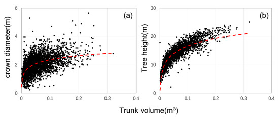 The scatterplots between volume and measured parameters of single tree: the red dash line is the trend line of the scatter, (a) is the scatterplot between volume and crown width and (b) is the scatterplot between volume and tree height.