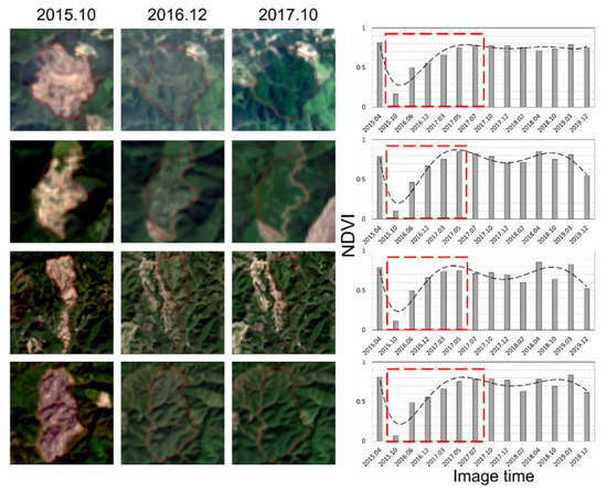 The images of four regions with different stages and time series average NDVI of selected regions from April 2015 to December 2019, the red dashed box is used to highlight the change in NDVI of eucalyptus over time, which gradually increases inside the red dashed box and stops changing outside the red dashed box.