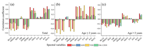 It has been reported that the width and depth of the eucalyptus crown are not sensitive to the FSV once the stand age reaches a certain age. To further explore the sensitivity between the FSV and spectral variables, three composite images, including two average images (BCC and ACC) and one difference image (DCC), were proposed to extract the variable set. Meanwhile, one single image (acquired on 1 February 2018) was also employed. Additionally, then, six bands and six indices were extracted from single and composite images, respectively. Additionally, all ground samples were divided into two groups: the first group was the samples with ages less than 2 years and the rest were the second group. The Pearson correlation coefficients between spectral variables and FSV were used to analyze the sensitivity of spectral variables related to growth characteristics of the crown in eucalyptus forest (Figure 6).