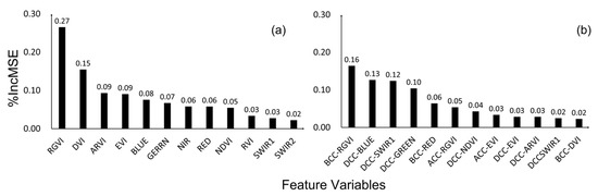 Additionally, to map the FSV of the eucalyptus forest, an importance assessment method based on random forest was employed to select the optimal variable set. The ranking of the importance of the spectral variables is shown in Figure 7. For the reference LC8 images, RGVI was the most important and SWIR2 was the least important (Figure 7a). For the composite LC8 images, RGVI (derived from BCC) was the most important variable and DVI (derived from BCC) was the least important variable among all alternative variables (Figure 7b).